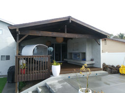 Deck, living room built-in fireplace, badminton and bocce ball court, outdoor fire pit.